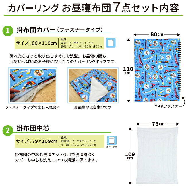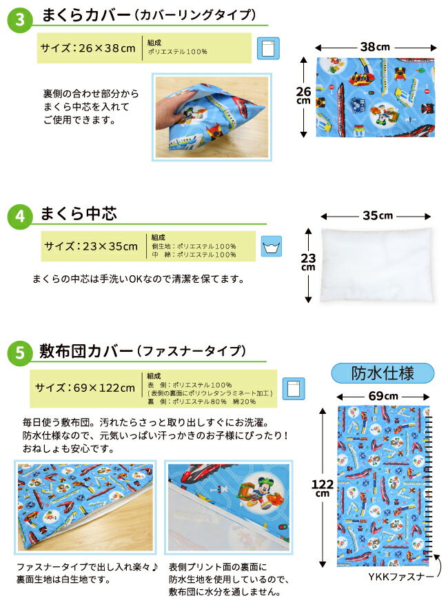 (C)Disney 商品番号:NZ1270-A 商品カテゴリ:お昼寝布団セット お昼寝布団 お昼寝 入園準備 保育園 幼稚園 カバーリング 防水カバー ファスナータイプ Disney ディズニー Mickey ミッキー 送料無料<ディズニー>お昼寝布団7点セット内容 1.掛布団カバー(ファスナータイプ)(裏側は白無地)【サイズ】80×110cm【組成】表側:ポリエステル100%裏側:ポリエステル80%・綿20%洗濯機でお洗濯できます 2.掛布団 中芯【サイズ】79×109cm【組成】側生地:ポリエステル100%中綿:ポリエステル100%洗濯機でお洗濯できます(ネット使用) 3.敷布団カバー(ファスナータイプ)(裏側は白無地)(防水加工)【サイズ】69×122cm【組成】表側:ポリエステル100%(表側の裏面にポリウレタンラミネート加工)裏側:ポリエステル80%・綿20%洗濯機でお洗濯できます 4.敷布団 中芯(固綿マットタイプ)【サイズ】67×120cm【組成】側生地:ポリプロピレン100%中綿:ポリエステル100%お洗濯できません 5.まくらカバー【サイズ】26×38cm【組成】ポリエステル100%洗濯機でお洗濯できます 6.まくら 中芯【サイズ】23×35cm【組成】側生地:ポリエステル100%中綿:ポリエステル100%手洗いできます 7.キルトバッグ(上部3ヶ所ヒモ付き)(防水加工)【サイズ】70×42×14cm【組成】表側:ポリエステル100%中綿:ポリエステル100%(裏面にポリウレタンラミネート加工)手洗いできます ※新生児の睡眠には使用しないでください。